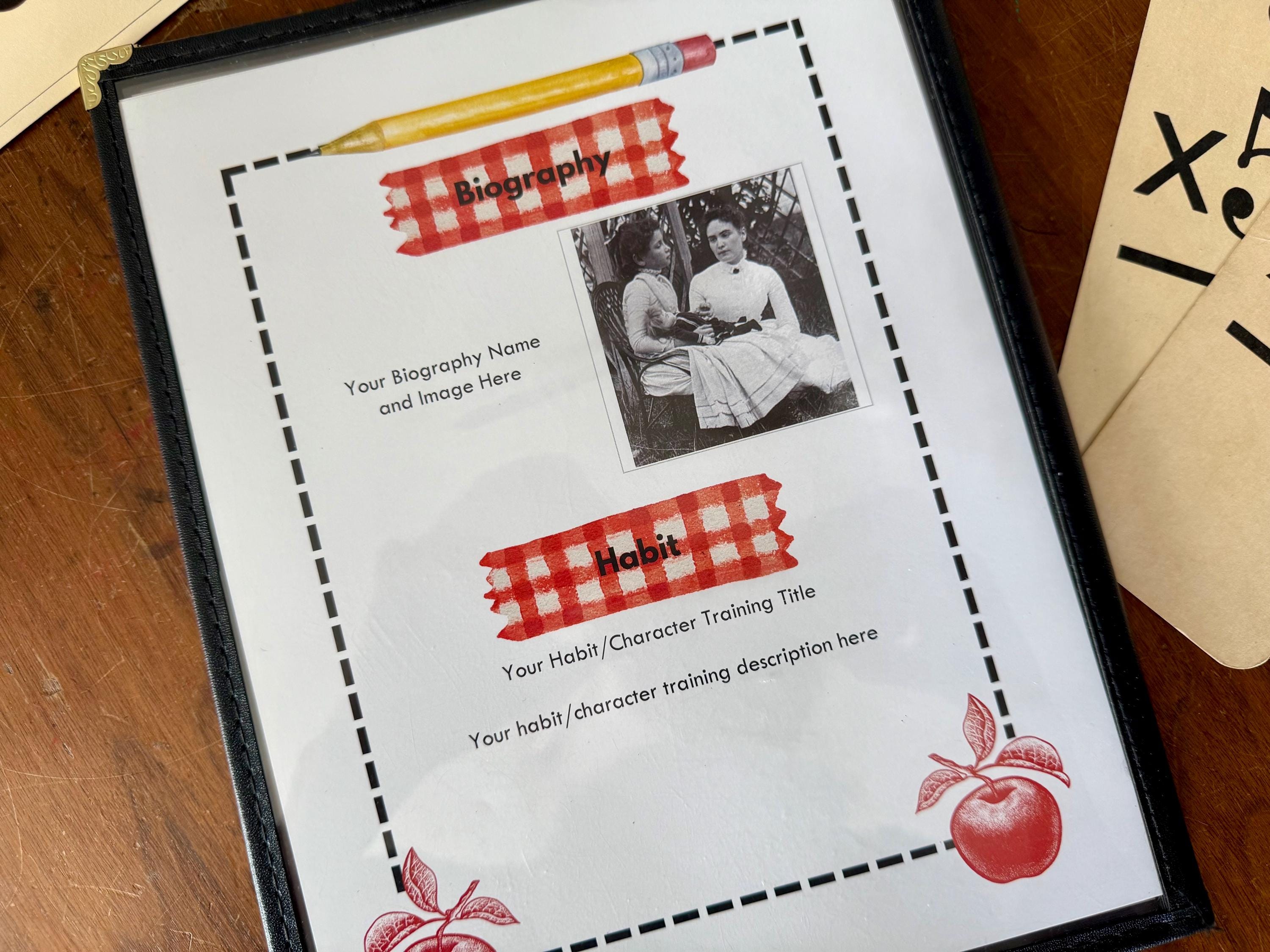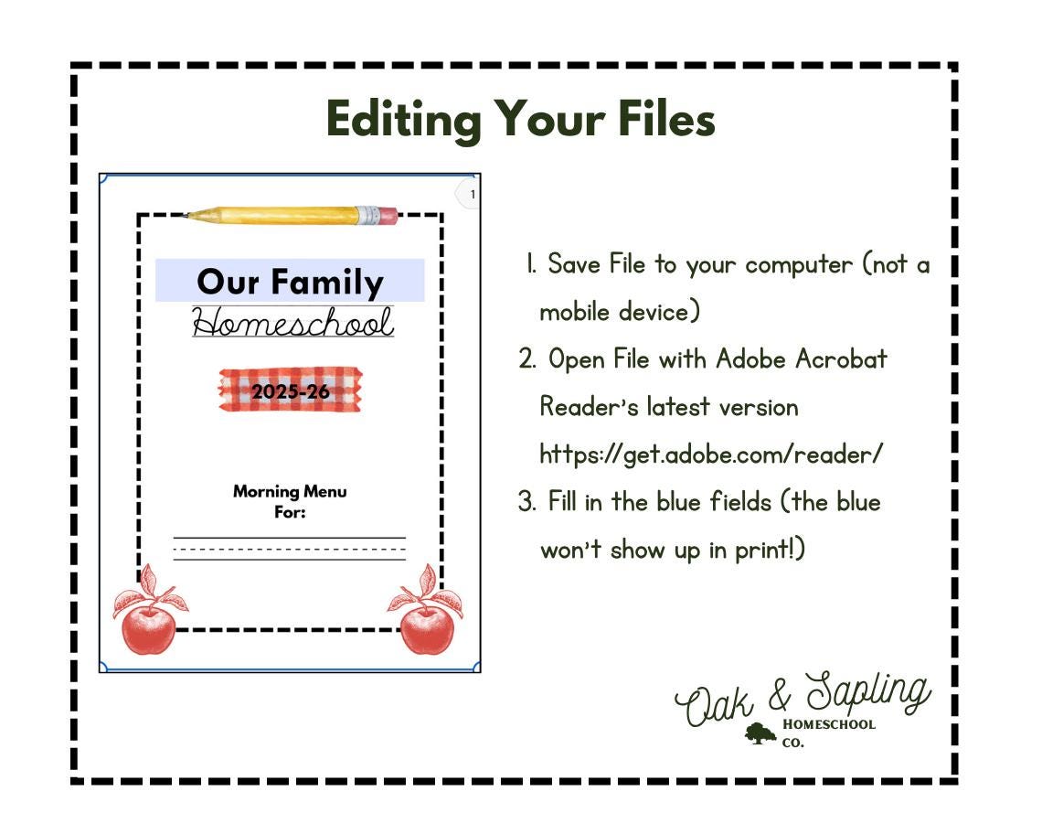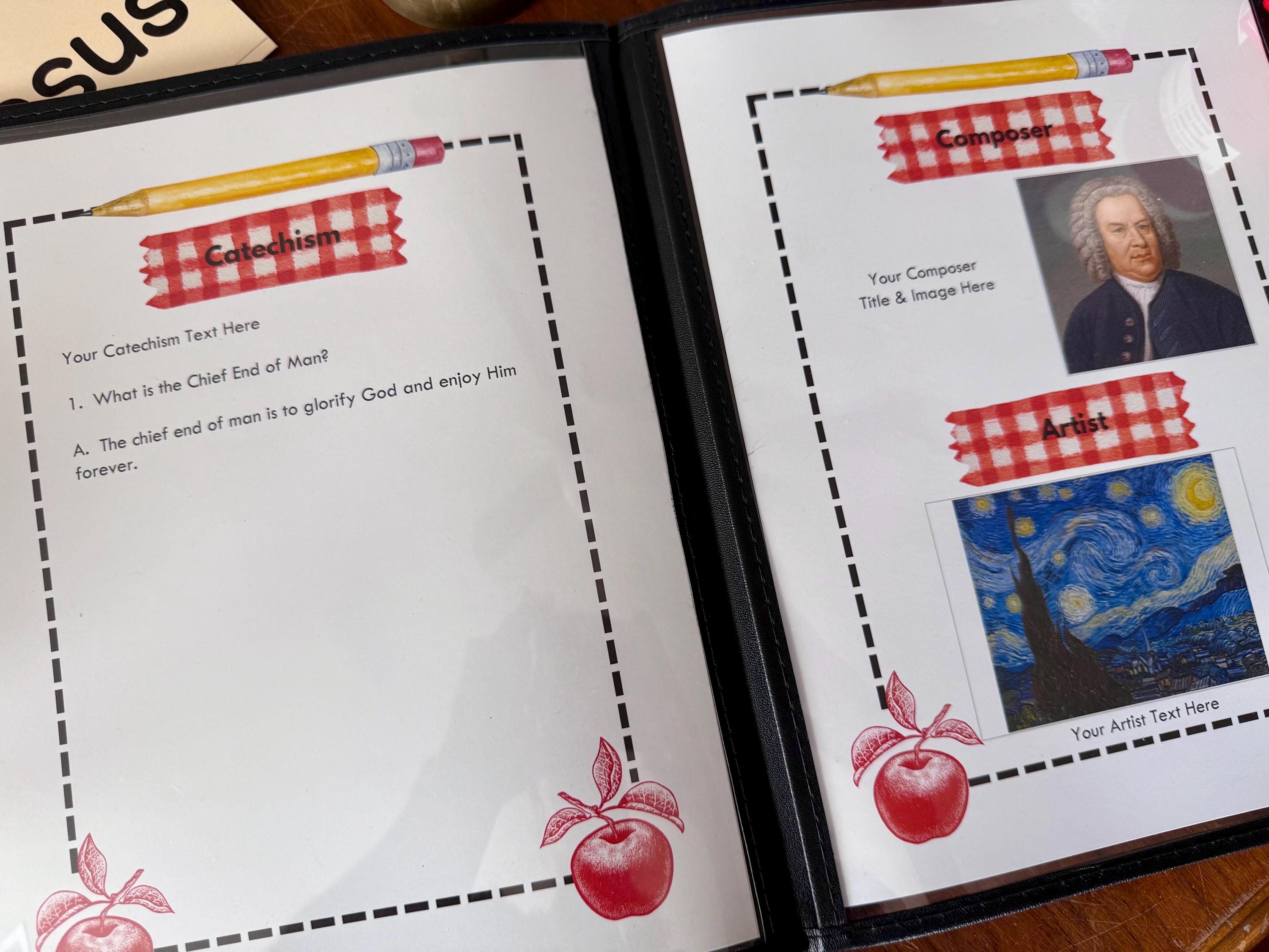 Your File Includes These Pages: -Cover Page -Calendar Date, Month and Year Practice -Daily Weather and Season Tracker -Scripture Memory Page -Hymn Study Page -Catechism Page -Skip Counting/Memory Work Page -Composer/Artist Page -Biography/Habit Training Page -Blank Editable Pages for your Custom Menu Items